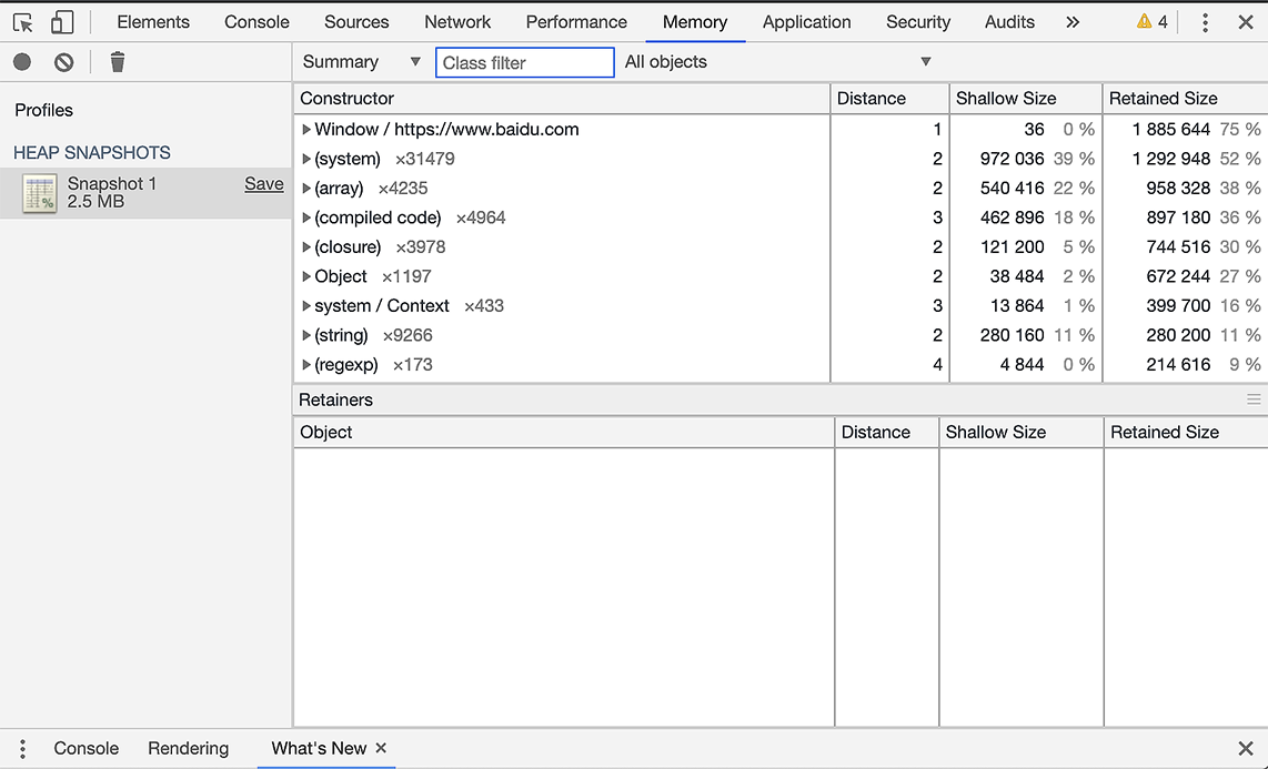 创建了函数对象,接下来我们就来看看构造函数和对象在内存中的状态。你可以将Chrome开发者工具切换到Memory标签,然后点击左侧的小圆圈就可以捕获当前的内存快照,最终截图如下所示: