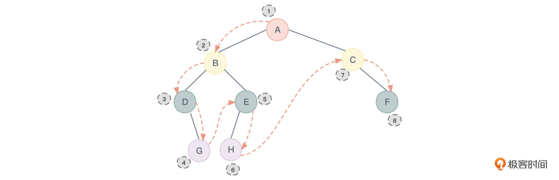 来看一看图3里,前序遍历时对普通二叉树节点的访问顺序: