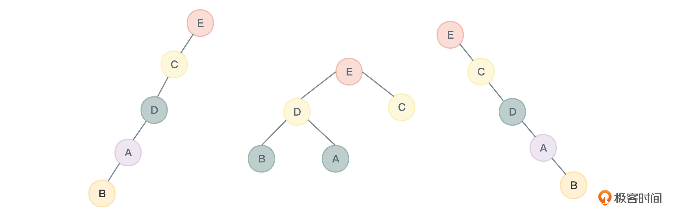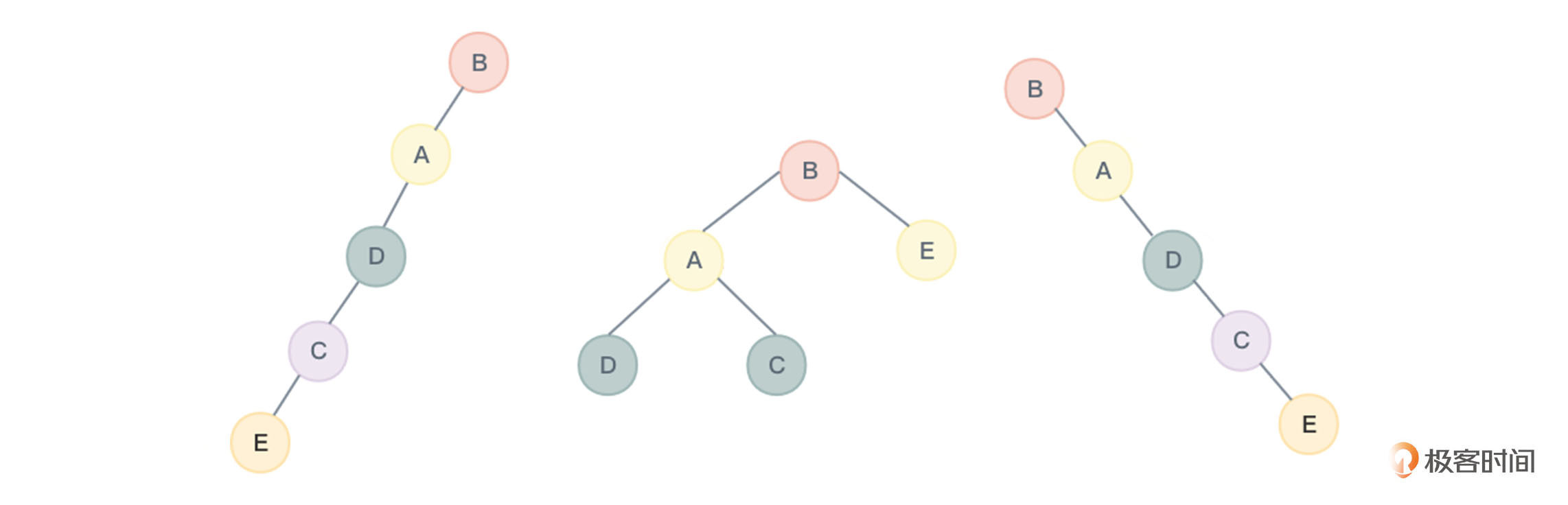 其次,已知前序遍历,同样无法唯一确定一棵二叉树。如图7所示的几棵二叉树,他们的节点数据内容不同,但进行前序遍历得到的序列都是BADCE: