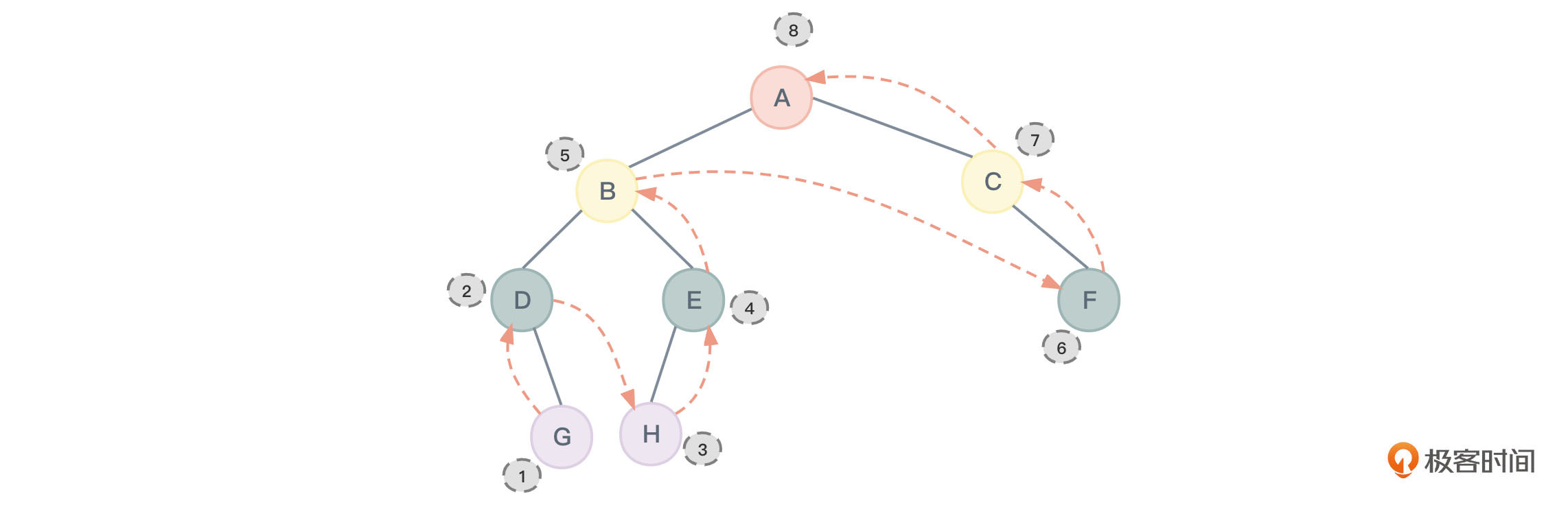最后,参考图5看一看后序遍历时对二叉树节点的访问顺序: