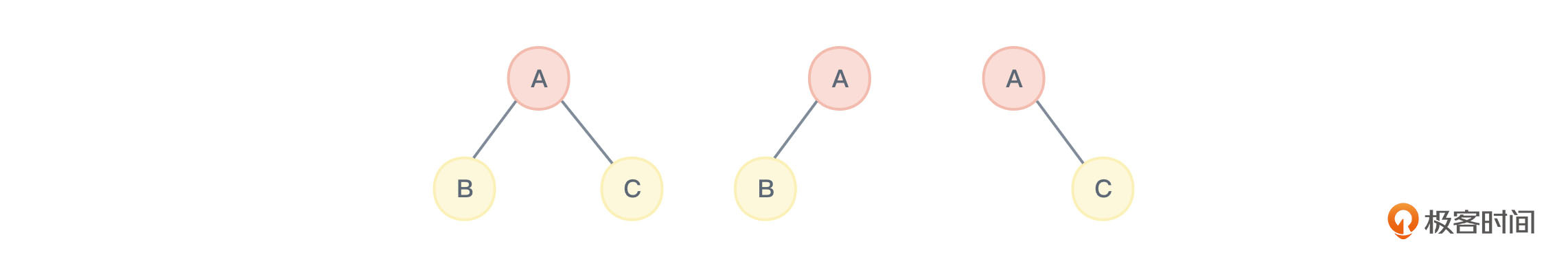 说回到图1。三类二叉树的遍历顺序,按照“根左右”的口诀,就应该是:ABC,AB,AC。