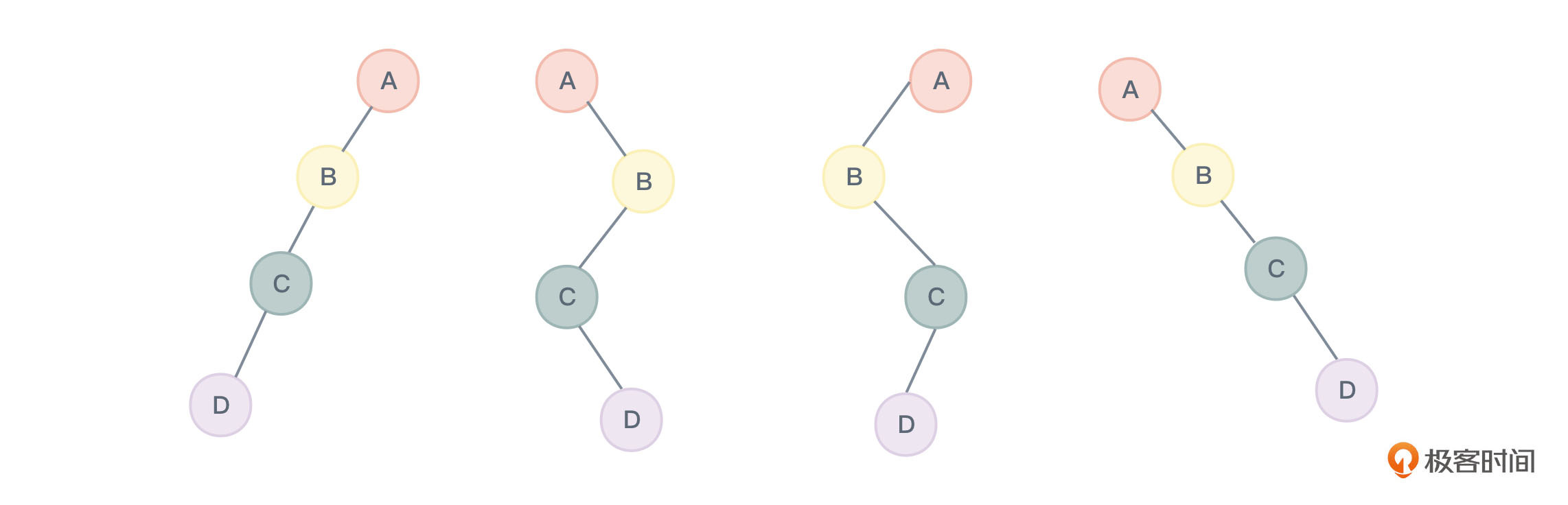 **那如果加一个条件,已知前序和后序遍历呢?**其实,还是同样无法唯一确定一棵二叉树。如图9所示的几棵二叉树。他们各不相同,但进行前序遍历得到的序列都是ABCD,进行后序遍历得到的序列都是DCBA: