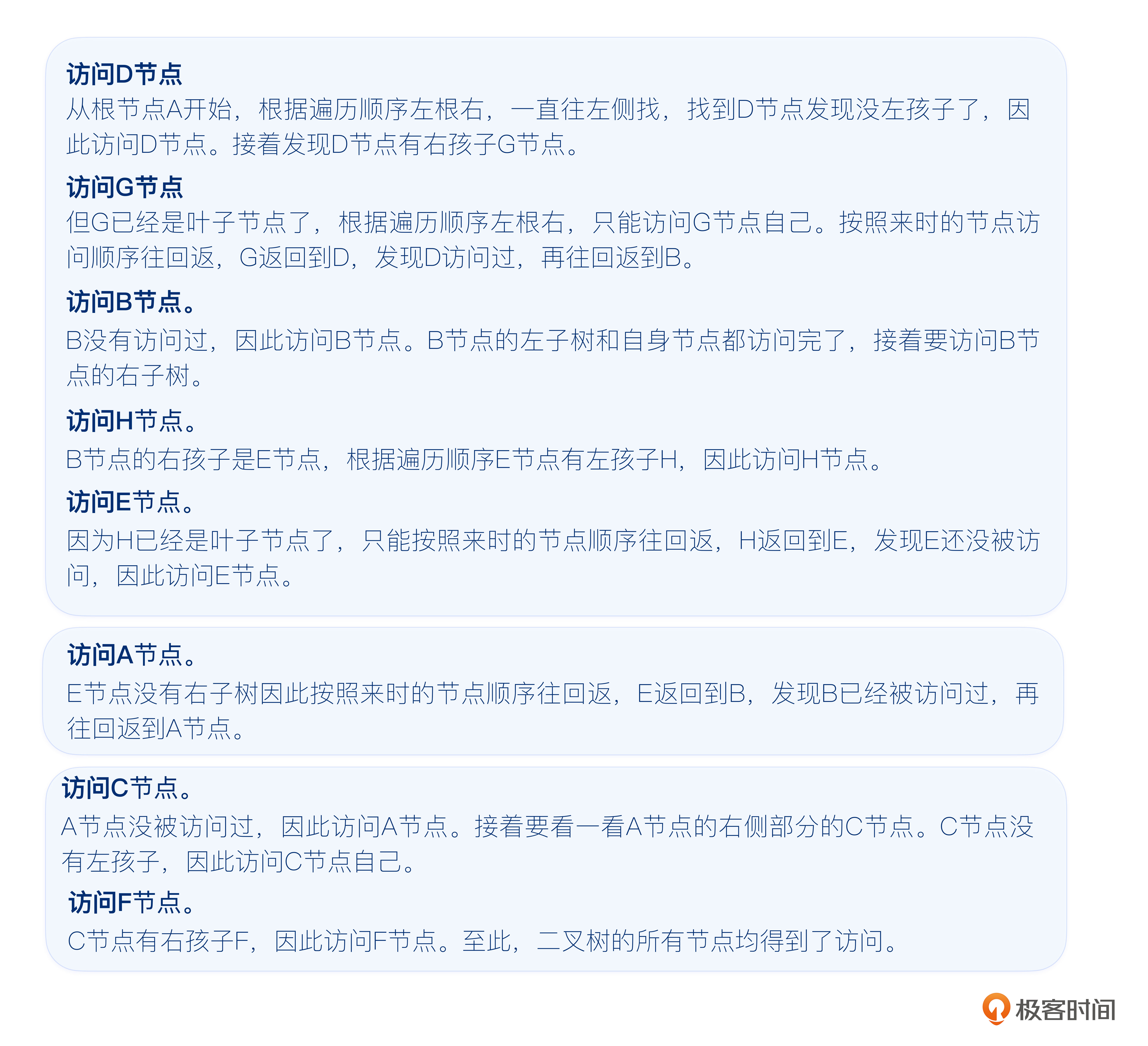 图4中序遍历对二叉树的遍历顺序为DGBHEACF。看一看这个遍历顺序是如何得出的。