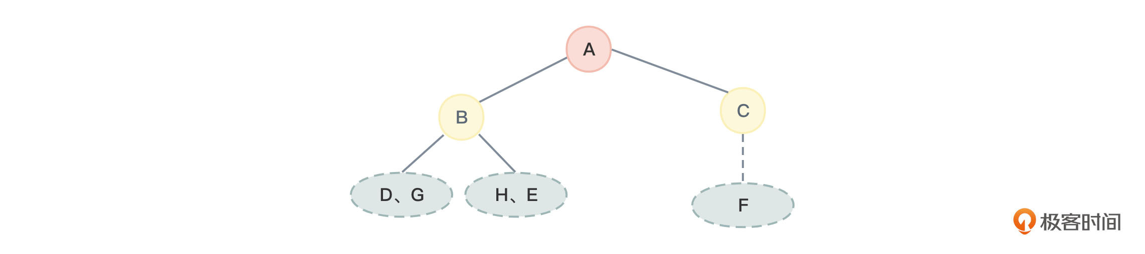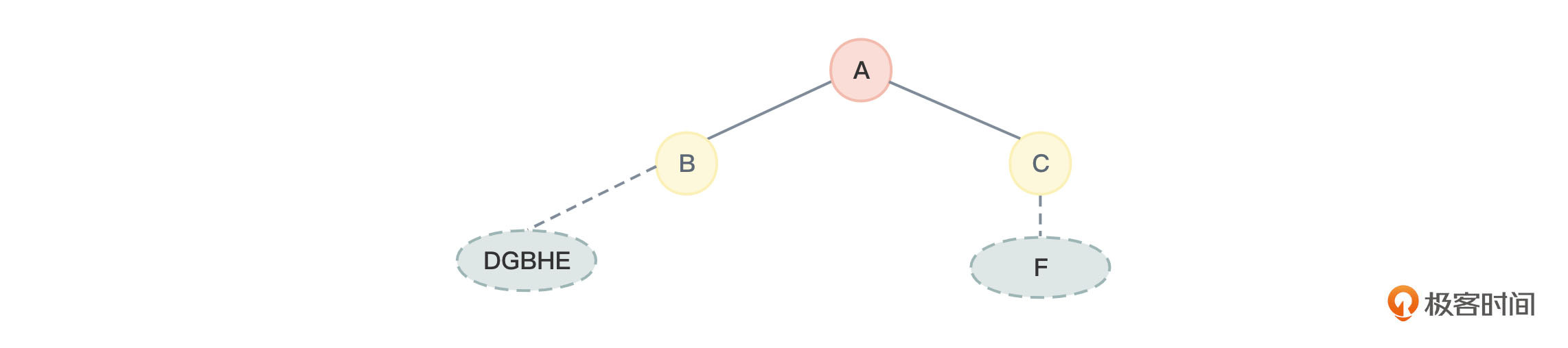- 看看左子树DGHE,根据中序遍历序列“DGBHEACF”的左根右规则,可以知道D、G是B的左子树中的节点,H、E是B的右子树中的节点,如图18所示: