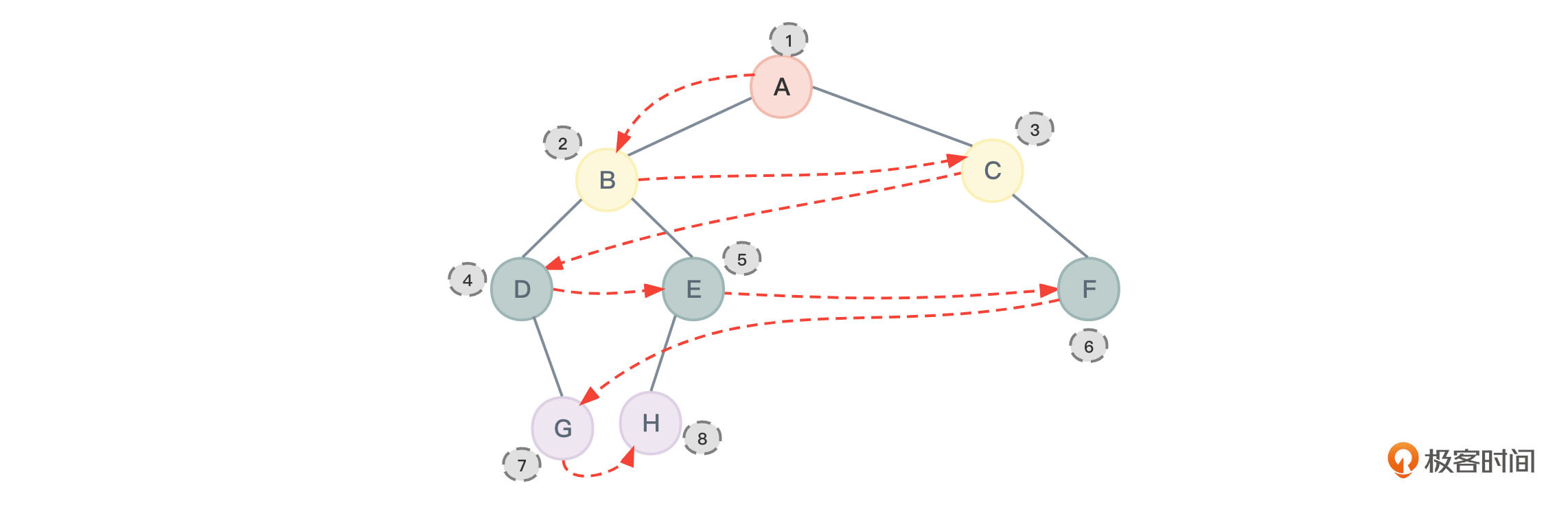 说了这么多,我们回到这节课的标题,强调一下到底什么是深度优先遍历和广度优先遍历,请你注意这两个概念的区别。