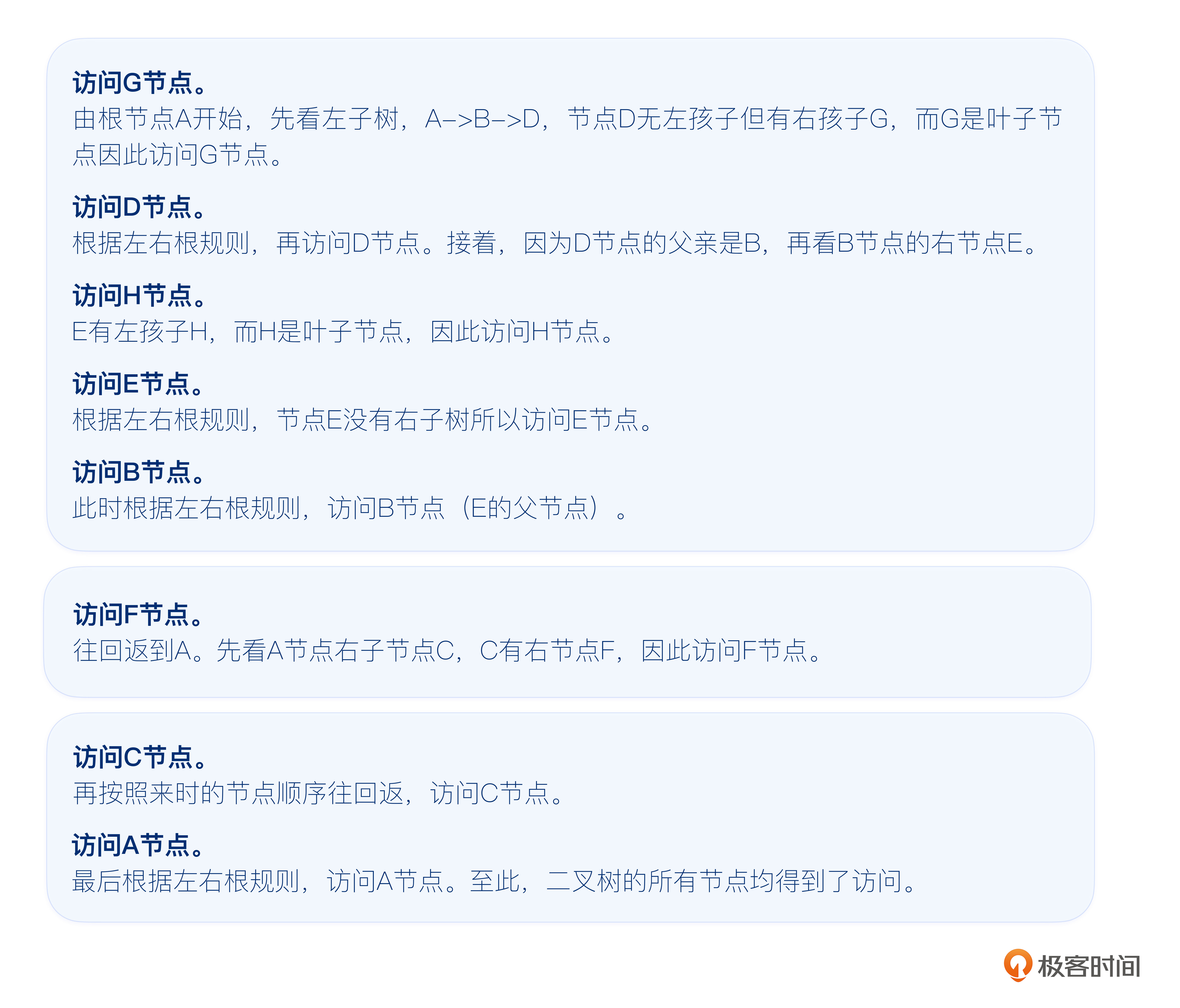 到这里,相信你也利用分支节点逐层展开的方式理解了前序、中序、后序遍历对节点的访问顺序,下面,我们再更换一种更适合书写递归程序的方式来解释前序、中序、后序遍历对节点的访问顺序。
