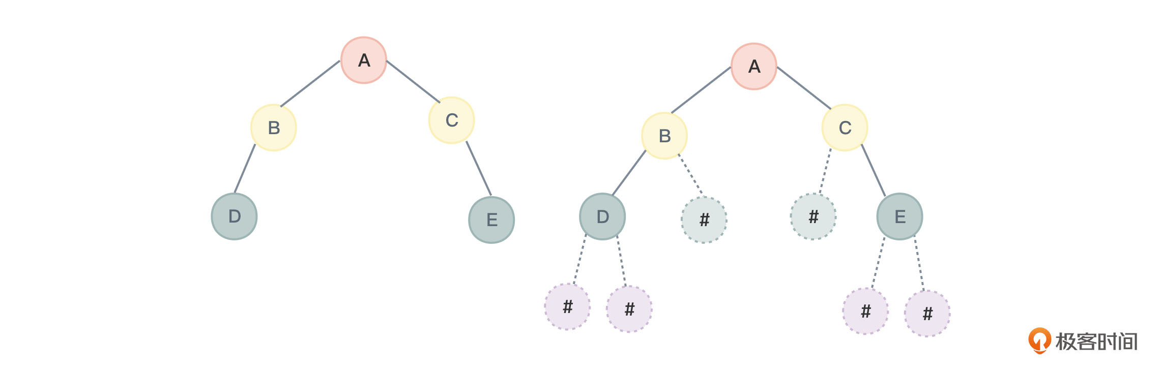 - 如果给出一个扩展二叉树的前序或后序遍历序列,是能够唯一确定一棵二叉树的。图13中,右侧的扩展二叉树的前序遍历序列为“ABD###C#E##”,通过这个序列是可以唯一确定图13左侧这个二叉树的。你不妨根据这个序列绘制一下对应的二叉树,看是否能够验证该结论的正确性。