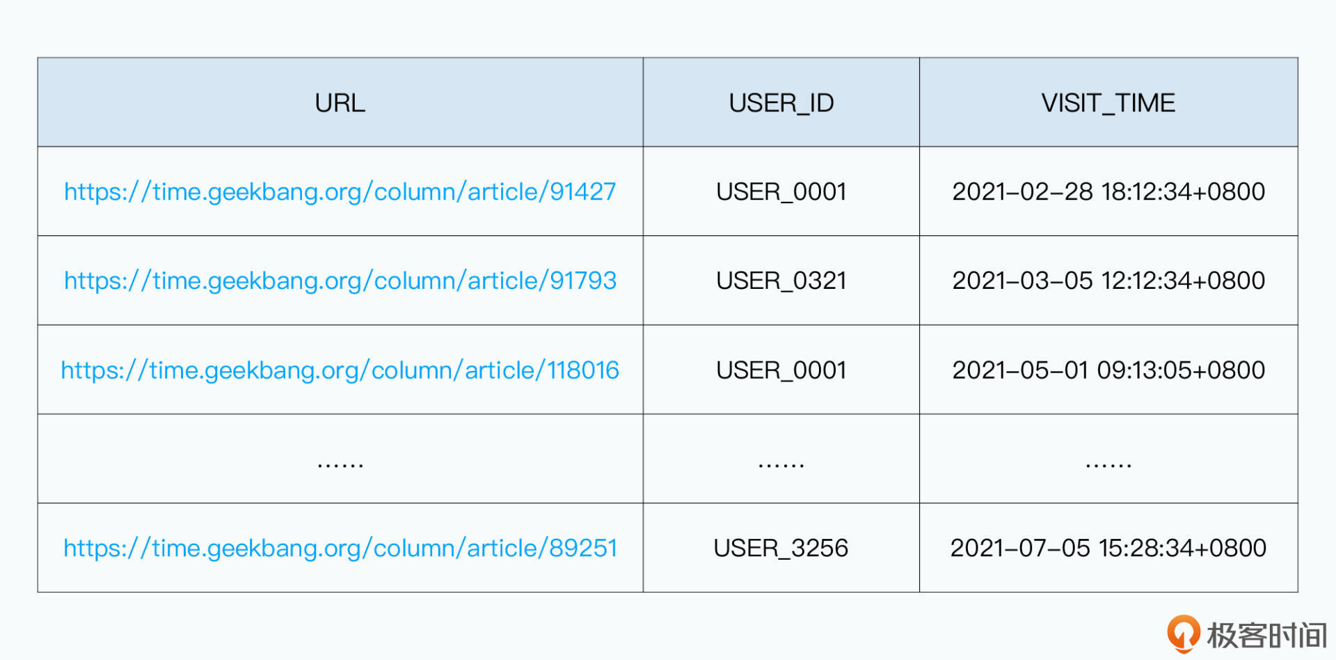 下面放了一个表格,我们把它叫做url_visit_logs 。在这个表格里面有三个字段,分别是: