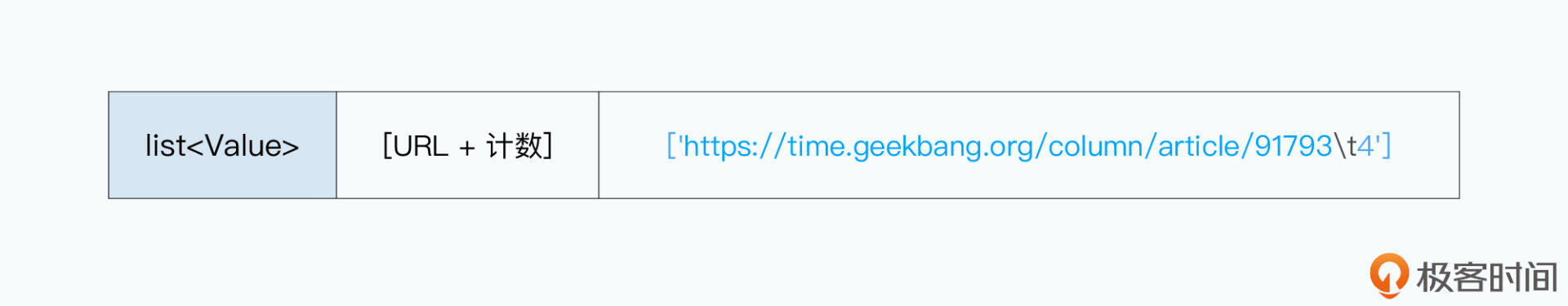 这个URL肯定不只被访问了一次,因为MapReduce框架会把所有相同URL的Map的输出记录,都混洗给到同一个Reduce函数里。所以在这里,Reduce函数拿到的输入数据是这样的:
