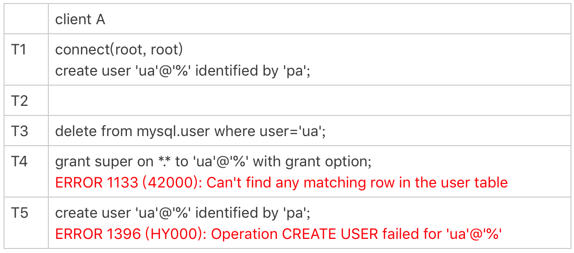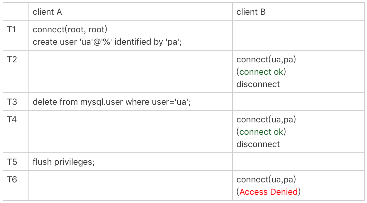 可以看到,T3时刻虽然已经用delete语句删除了用户ua,但是在T4时刻,仍然可以用ua连接成功。原因就是,这时候内存中acl_users数组中还有这个用户,因此系统判断时认为用户还正常存在。