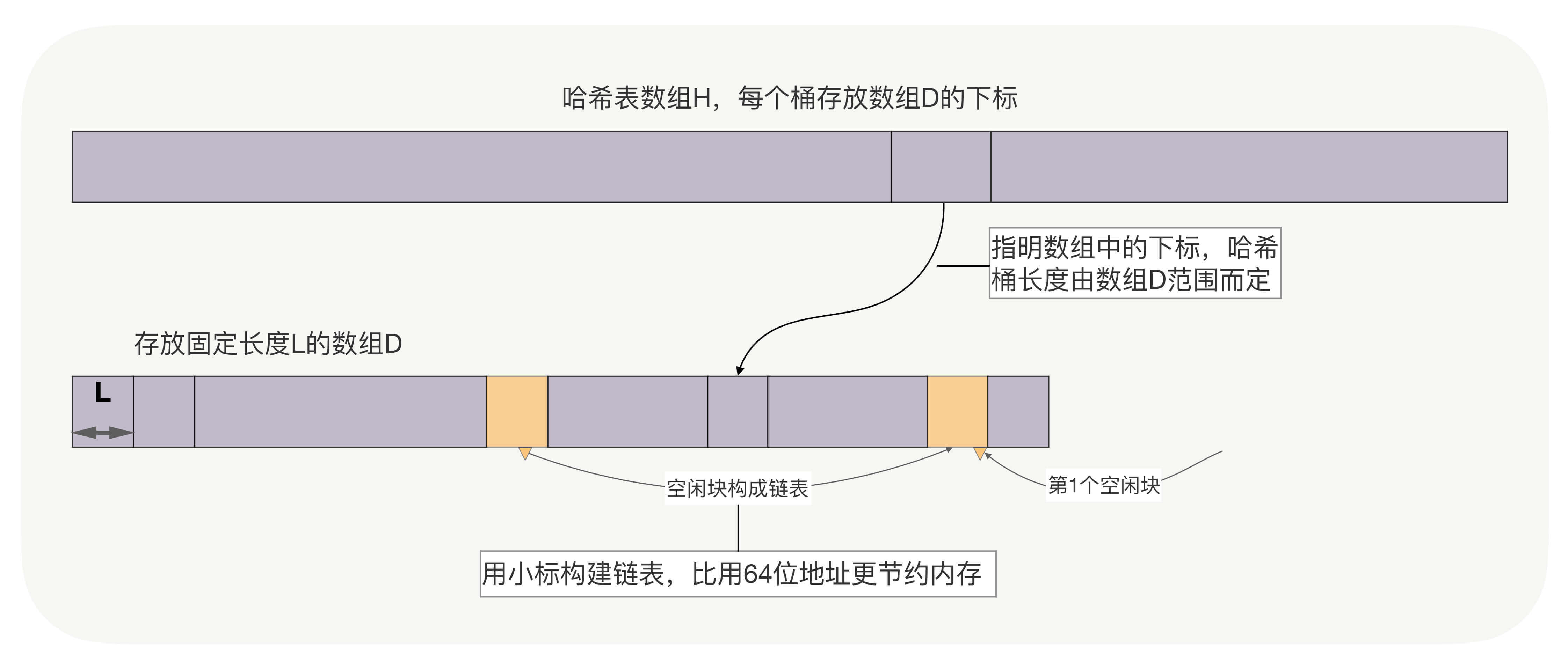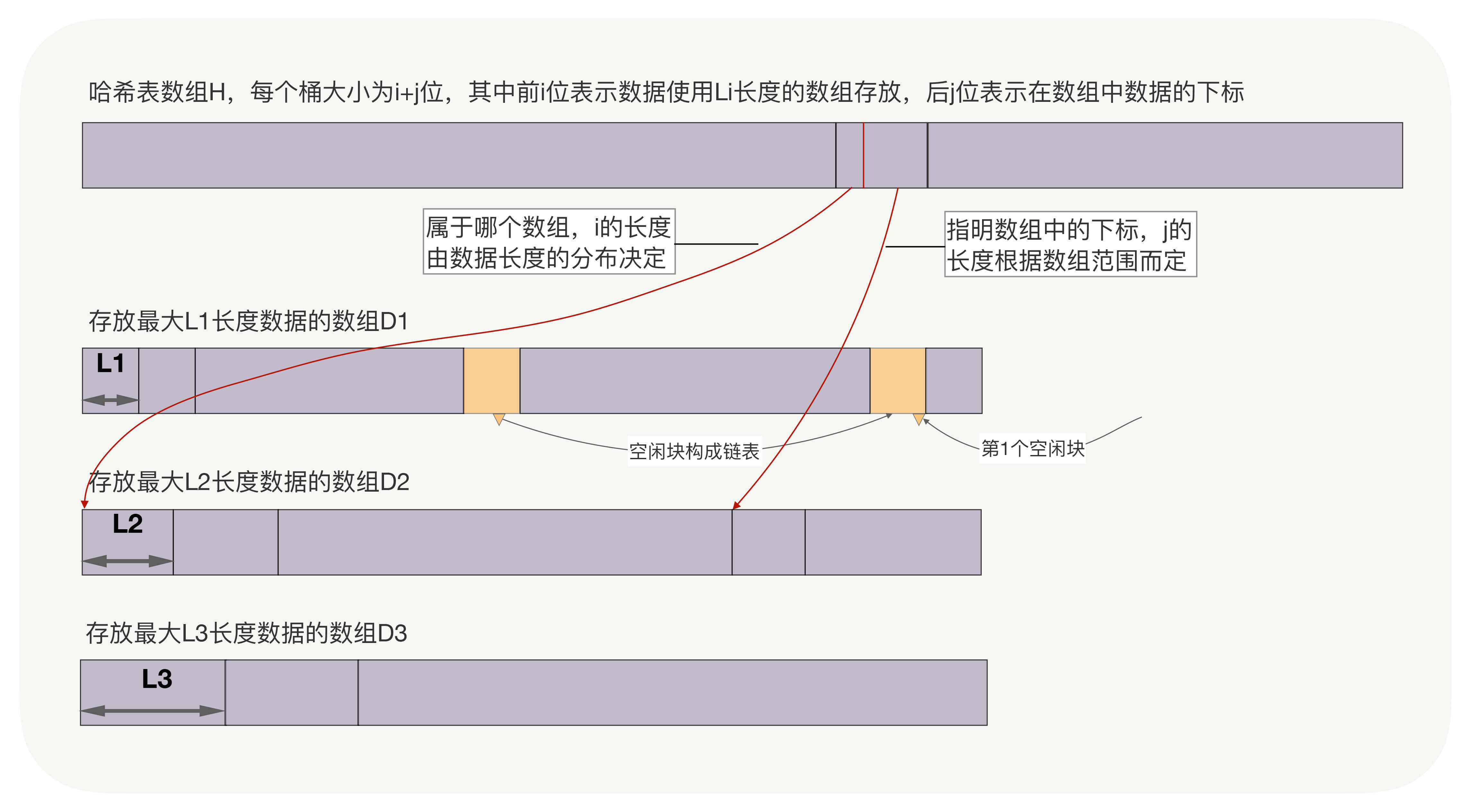 **二、数据的长度并不固定。**此时,可以采用有限个定长数组存放数据,用以空间换时间的思想,加快访问速度。如下图中,D1数组存放长度小于L1的数据,D2数组存放长度在L1和L2之间的数据,以此类推。而哈希表数组H中,每个桶用i位存放该数据在哪个数组中,用j位存放数组下标。查找数据时,前i位寻找数组,后j位作为数组下标直接访问数据。