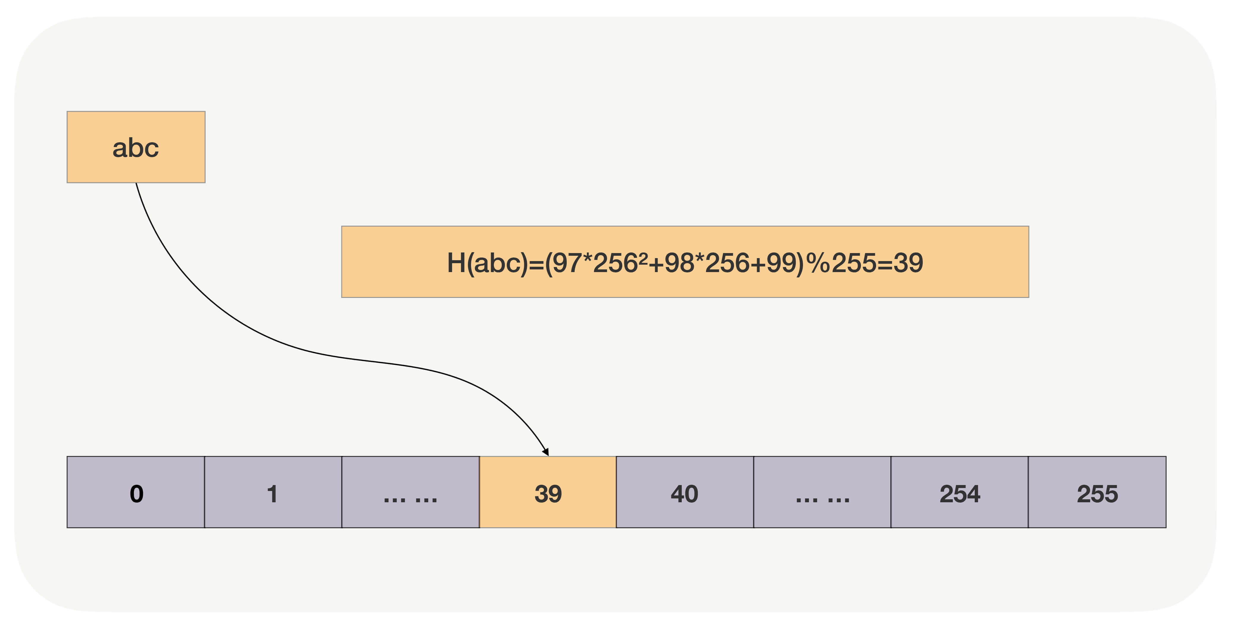 其次,哈希函数直接把查询关键字转换为数组下标,再通过数组的随机访问特性获取数据。比如,如果关键字是字符串,我们使用BKDR哈希算法将其转换为自然数,再以哈希数组大小为除数,对它进行求余,就得到了数组下标。如下图所示,字符串abc经过哈希函数的运算,得到了下标39,于是数据就存放在数组的第39个元素上。(注意,这是个很糟糕的哈希函数,它使用的基数是256,即2的8次方,下文我们会解释它为什么糟糕。)