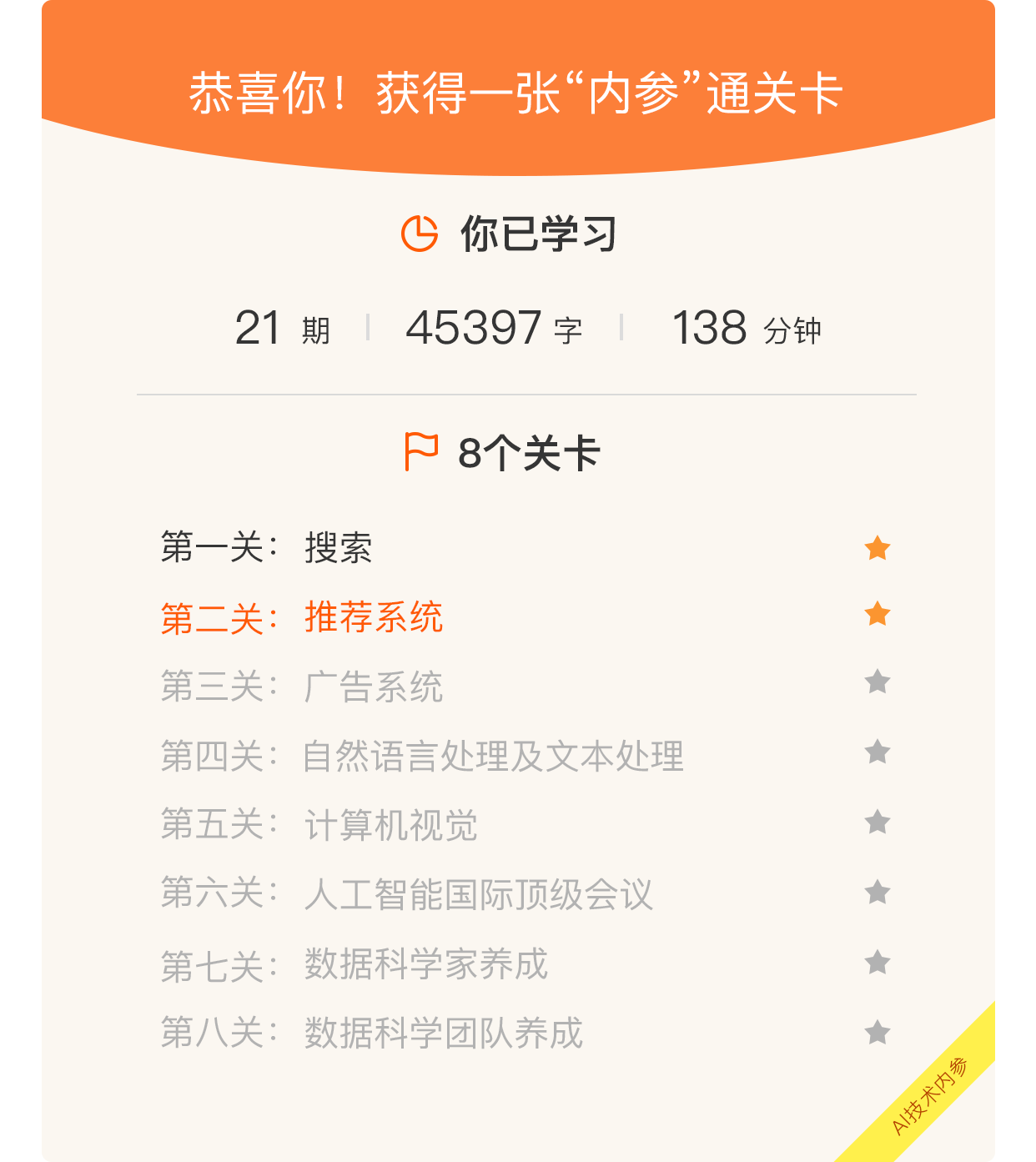 最后,恭喜你在这个模块中已经阅读了45397字,听了138分钟的音频,获得一张新的通关卡,这是一个不小的成就。在人工智能领域的千里之行,我们又往前迈出了一步。