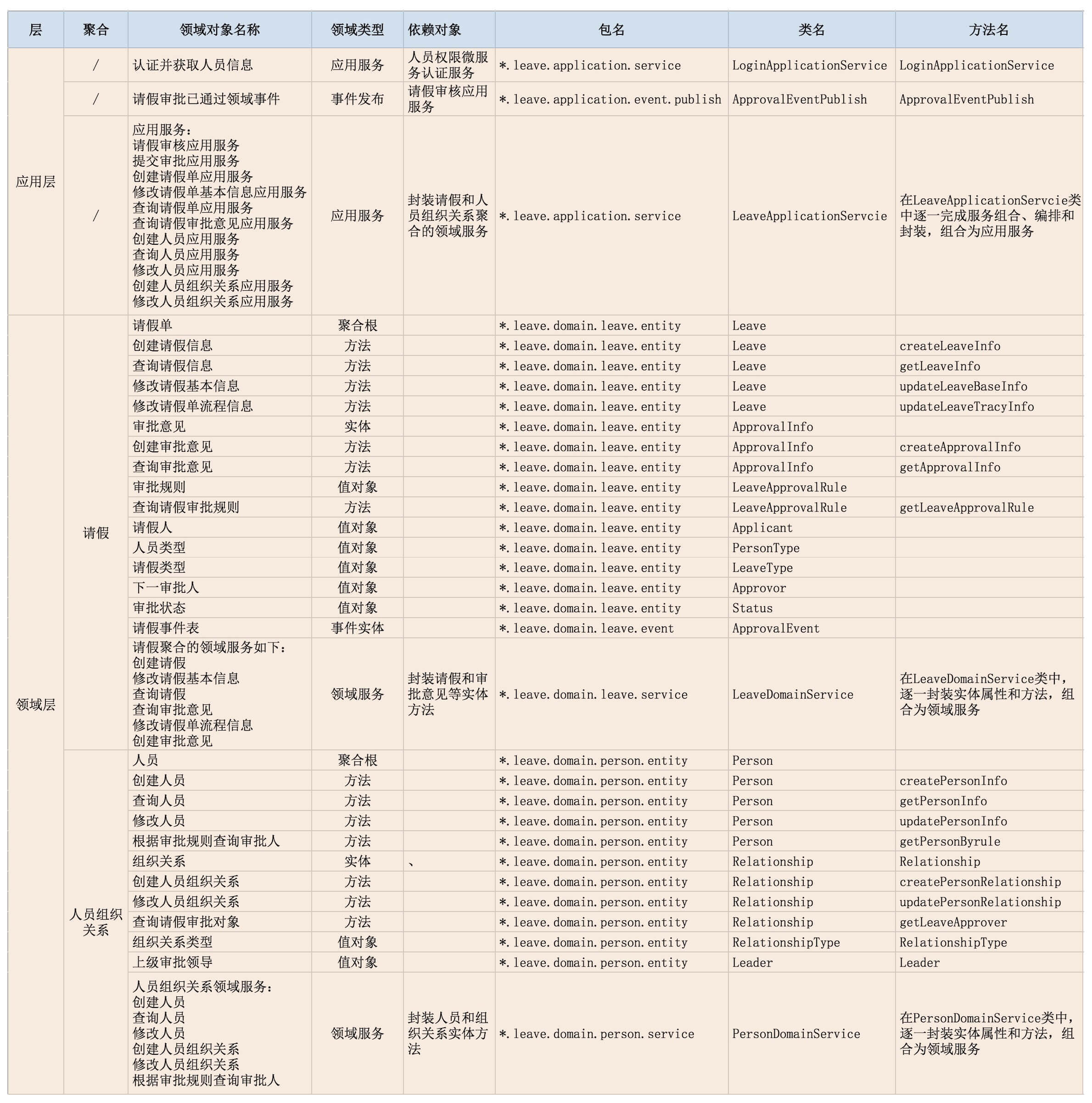 根据DDD的代码模型和各领域对象所在的包、类和方法,我们可以定义出请假微服务的代码结构,设计代码对象。