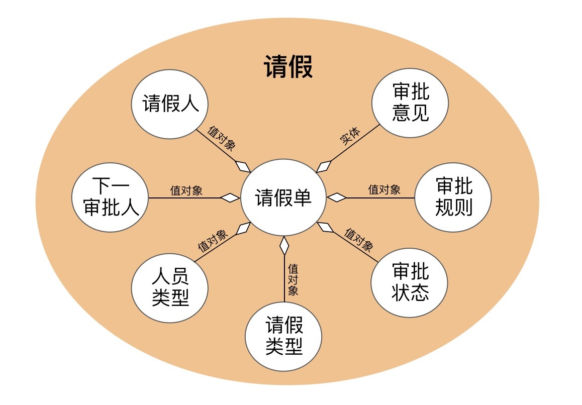 请假单经多级审核后,会产生多条审批意见,为了方便查询,我们可以将审批意见设计为实体。请假审批通过后,会产生请假审批通过的领域事件,因此还会有请假事件实体。请假聚合有以下实体:审批意见(记录审批人、审批状态和审批意见)和请假事件实体。