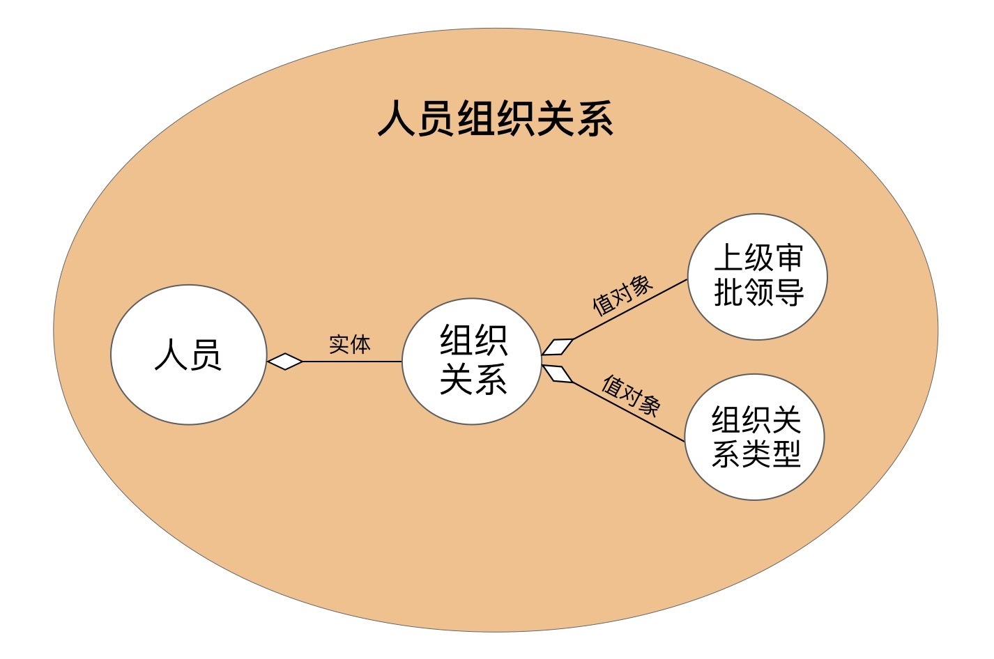 在人员组织关系聚合中,我们可以建立人员之间的组织关系,通过组织关系类型找到上级审批领导。它的聚合根是人员,实体有组织关系(包括组织关系类型和上级审批领导),其中组织关系类型(如项目经理、处长、总经理等)是值对象。上级审批领导来源于人员聚合根,可设计为值对象。人员组织关系聚合将包含以下值对象:组织关系类型、上级审批领导。