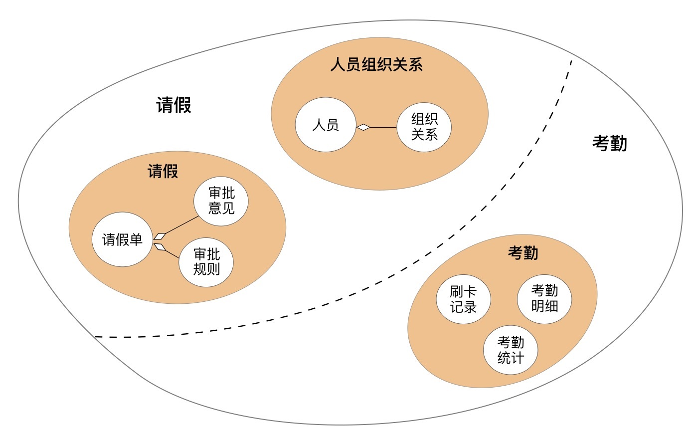 由于人员组织关系聚合与请假聚合,共同完成请假的业务功能,两者在请假的限界上下文内。考勤聚合则单独构成考勤统计限界上下文。因此我们为业务划分请假和考勤统计两个限界上下文,建立请假和考勤两个领域模型。