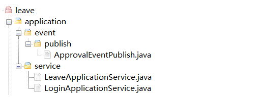 应用层包括:应用服务、DTO以及事件发布相关代码。在LeaveApplicationService类内实现与聚合相关的应用服务,在LoginApplicationService封装外部微服务认证和权限的应用服务。