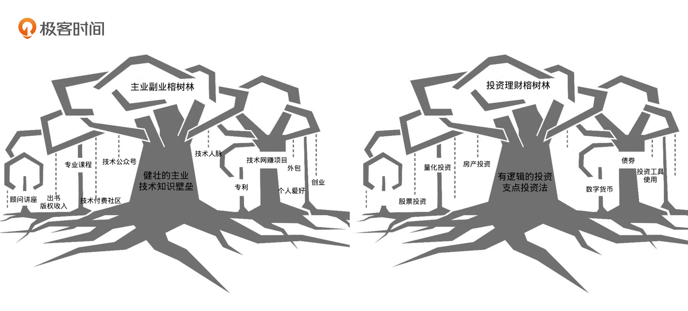今天这一讲,我们讨论了如何拓展财富渠道的问题。关于这个问题,我们可以用“五个要点,一片榕树林”来总结。