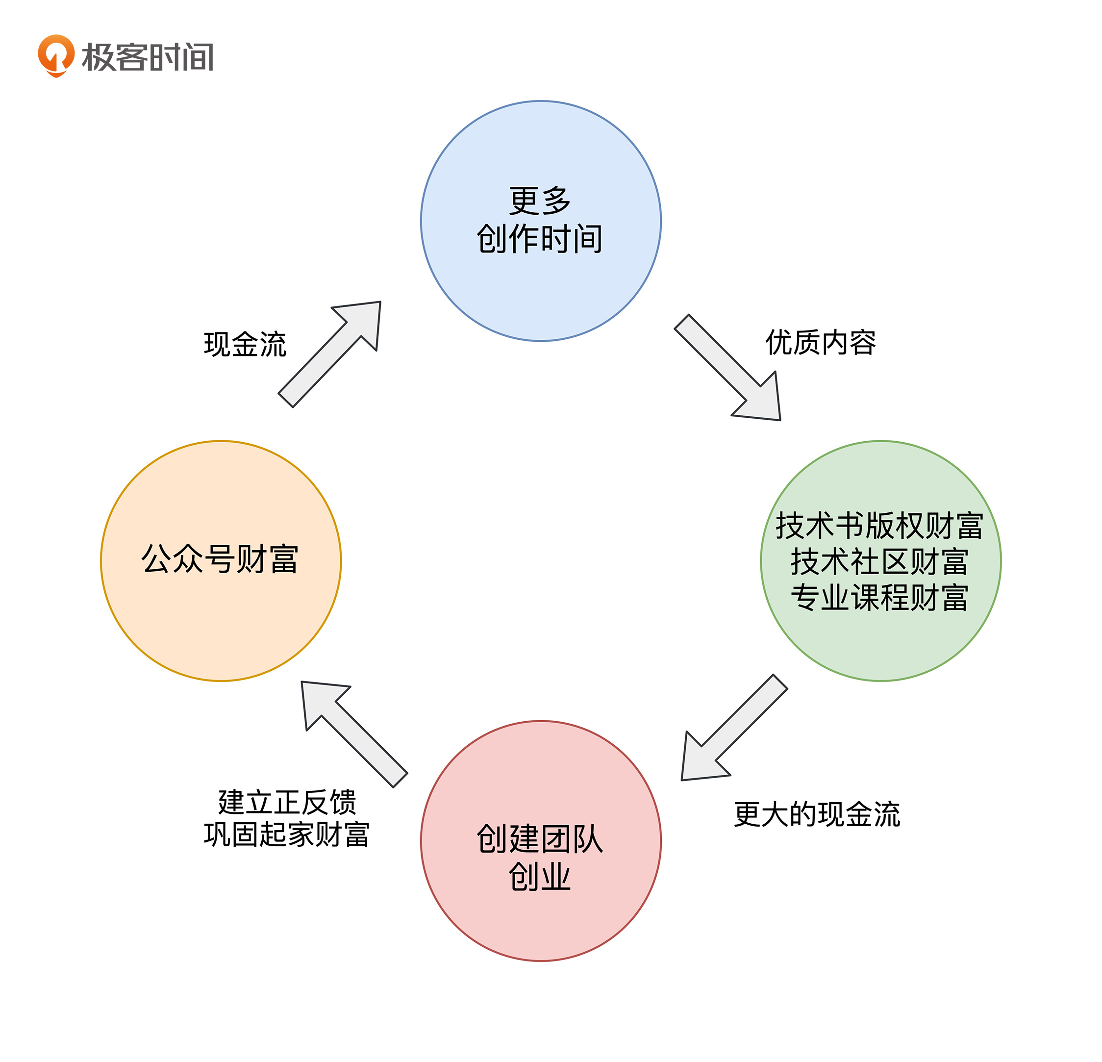 然后,由于小H在之前的几个阶段已经积累了大量粉丝,这本书一上市就自带热度,迅速畅销。这也进一步扩大了小H的影响力,扩充了他的收入来源。再之后,相应的知识社区、付费社群也建立起来,产生了更大的现金流,帮助小H能够付费进行约稿,进行更多的内容输出。这些都使小H在技术圈的影响力持续扩大,又反过来推动了公众号的扩张。