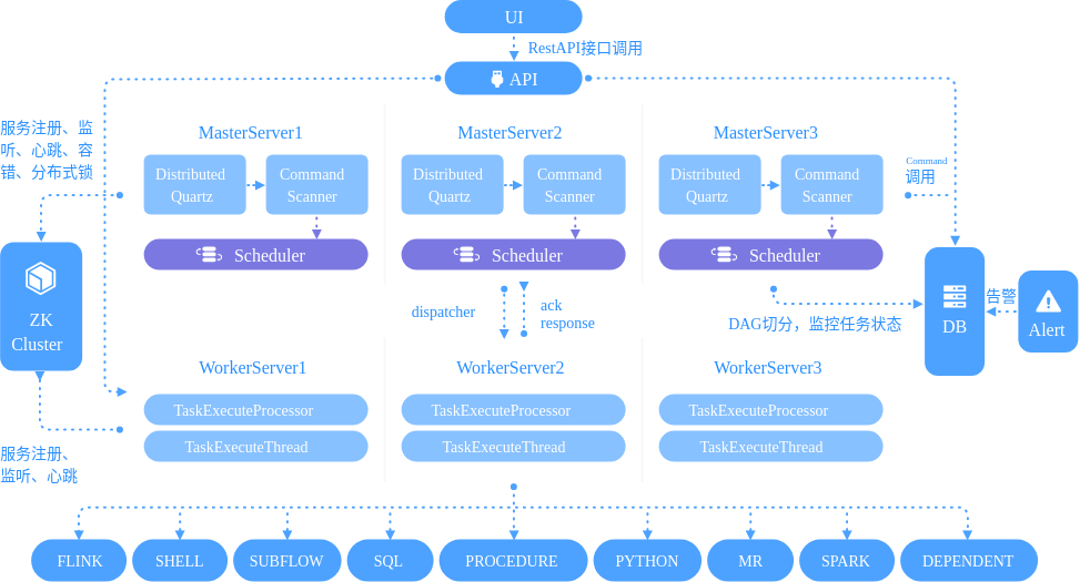在业务层面,我们很多时候也会开发很多后台作业,为了提升这些作业的性能和作业的可用性,我们也会基于分布式任务调度框架,进行后台作业的分布式调度。我给你举个具体点的例子,带你看看Apache DolphinScheduler的架构图: