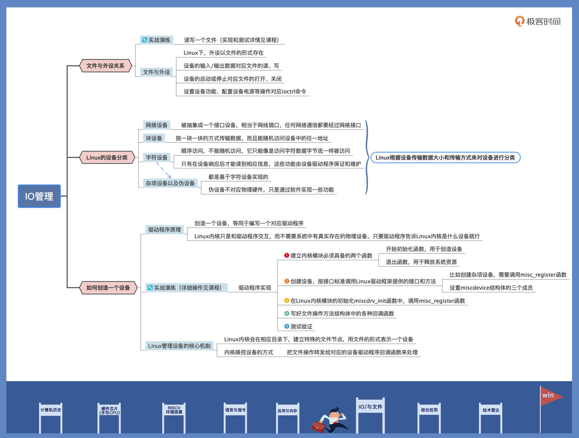 这就是Linux管理多个IO设备的方式,但是Linux驱动模型远比今天课程所介绍的复杂得多,其中还有支持总线和支持设备热拔插的机制。如果你想详细了解Linux驱动模型的实现,可以阅读我的上一季课程《操作系统实战 45 讲》中的第二十八节课到三十一节课。