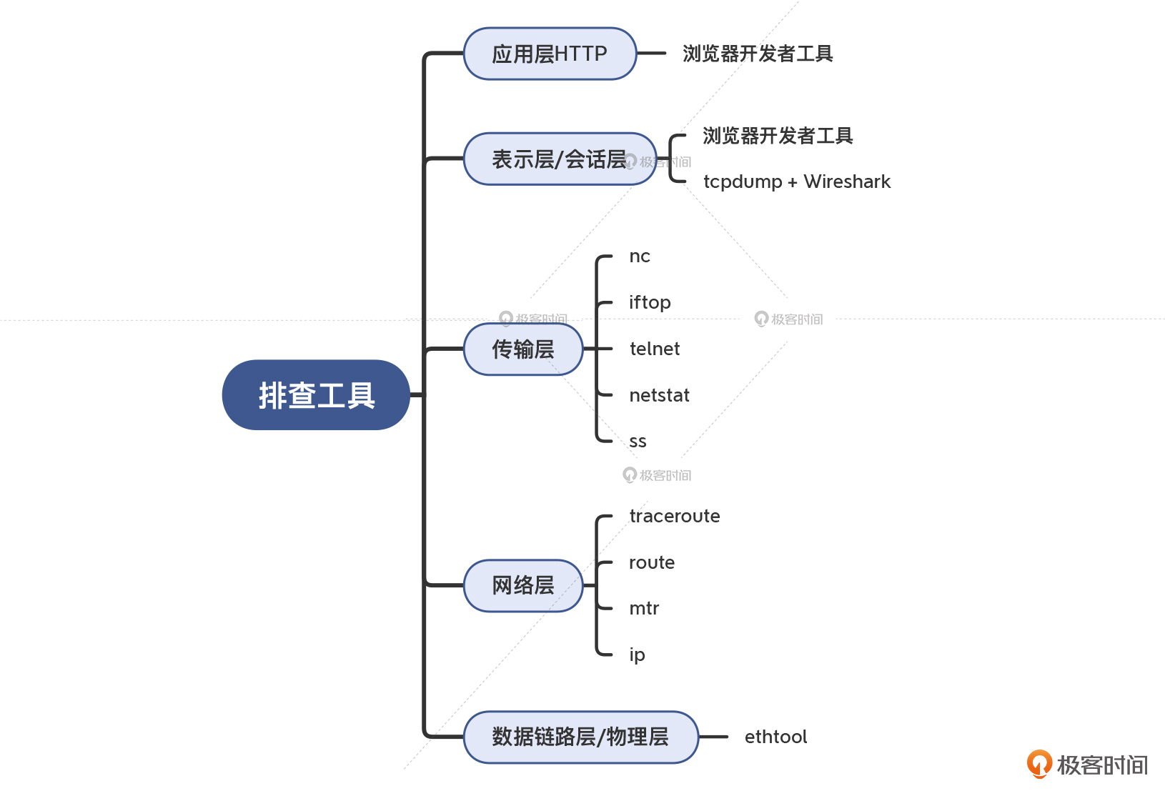 然后,我们逐一学习了各层的常用排查工具。我来给你再梳理一下: