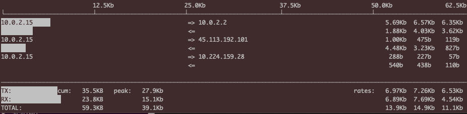 有时候,你的网络跑得挺繁忙的,但你却不知道哪个连接占用了大量的带宽?你可以用 iftop。这个工具不是系统默认自带的,需要你安装一下,然后执行iftop就好了。对了,你需要有sudo权限,也就是执行sudo iftop,然后就能看到不同连接的传输速率,把祸害你带宽的连接给找到。比如下面这样: