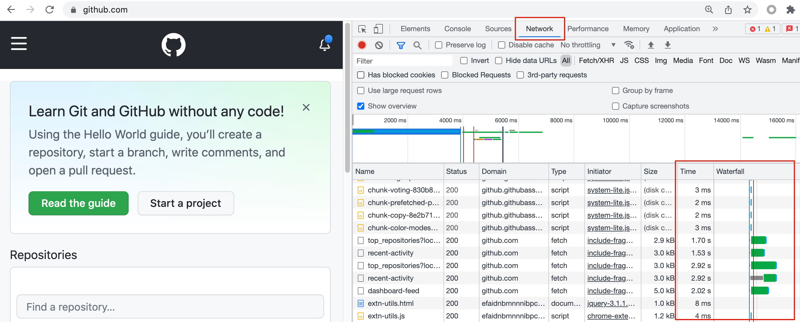 访问页面感觉很慢,那么可以借助开发者工具的时间统计功能,找到耗时较高的HTTP资源对象,再针对性排查。比如我觉得访问https://github.com很慢,那么可以先打开开发者工具,然后访问站点,等全部加载完成后,到Network页查看这些HTTP对象的加载时间。