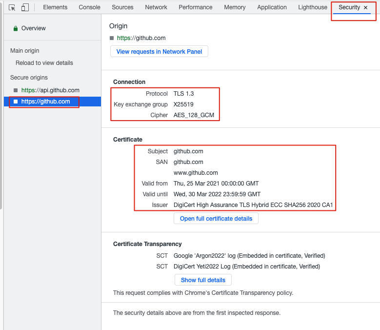 另外,使用开发者工具的Security菜单,还可以查看更为详细的TLS信息,包括协议版本、密钥交换算法、证书有效期等等。