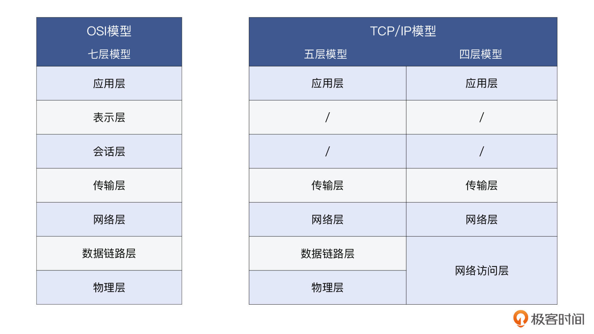 说到具体的分层模型,你应该会想到两种比较有名的方案。对,它们就是OSI的七层模型,和TCP/IP的四层/五层模型。这两种模型的最大区别,就是前者在传输层和应用层之间,还有会话层和表示层,而后者没有。