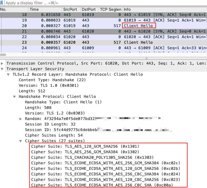 比如,我们可以直接看到TLS握手阶段里,双方协商过程中各自展示的Cipher suite,而在开发者工具里,我们只能看到协商完成后的选择。