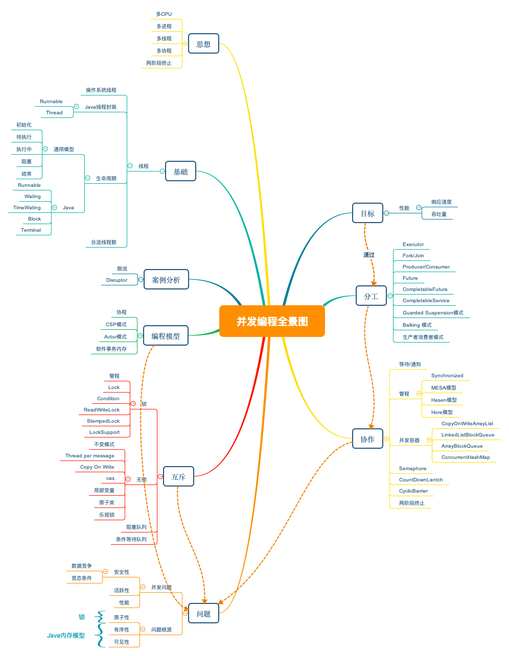 总体来说,学习完这个专栏后,我获益良多,不仅是对并发编程有了系统化的理解,也第一次针对并发编程绘制出了自己的全景图(如下图)。生有涯而学无涯,相信这些知识图谱定能给我指明前进方向,点亮我的技术人生。