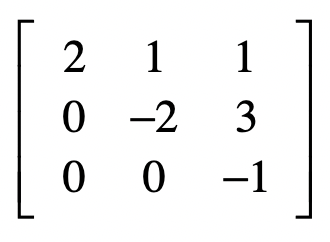 从此可以看出,消元的过程就是把原始的系数矩阵变为上三角矩阵。这里的上三角矩阵表示,矩阵中只有主对角线以及主对角线以上的三角部分里有数字。我们用$U$表示上三角矩阵。