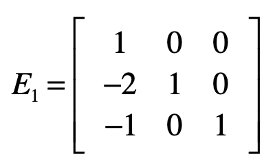 对于第一个方程式,如果要保持它不变,我们可以让向量$[1, 0, 0]$左乘$A$。对于第二个方程,具体操作是让第二个方程式减去第一个方程式的两倍,达到消除$x_1$的目的。我们可以让向量$[-2, 1, 0]$左乘$A$。对于第三个方程式,具体操作是让第三个方程式减去第一个方程式,达到消除$x_1$的目的。我们可以让向量$[-1, 0, 1]$左乘$A$。我们使用这三个行向量组成一个矩阵$E1$。