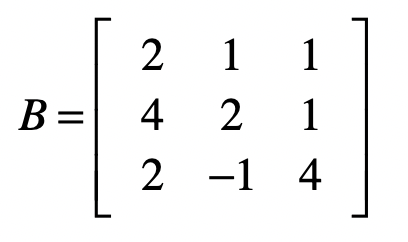 为了进行矩阵操作,首先我们要把方程中的系数$b_i$转成矩阵,我们把这个矩阵记作$B$。对于上面的方程组示例,系数矩阵为: