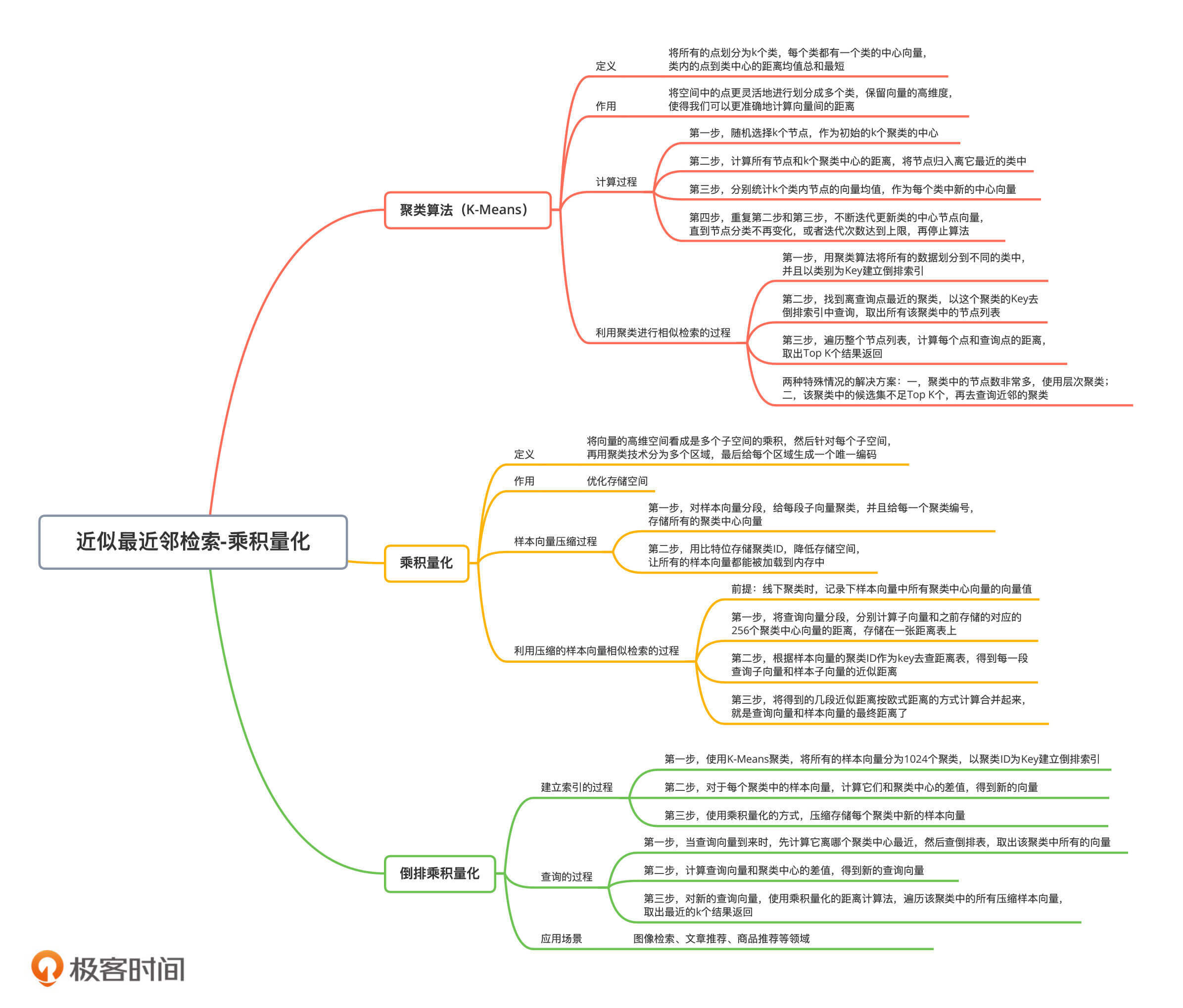 那为了进一步提高检索率和优化存储空间,我们还能将聚类技术、乘积量化和倒排索引技术结合使用。这也是目前图像检索和文章推荐等领域中,非常重要的设计思想和实现方案。
