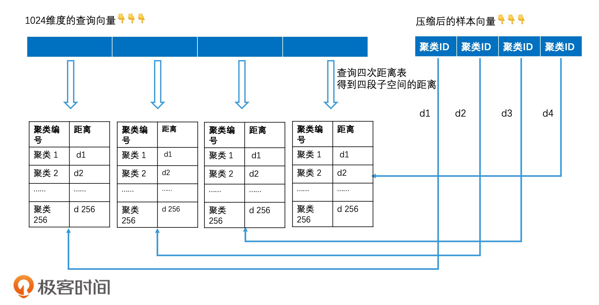然后,对于查询向量,我们也将它分为4段,每段也是一个256维的向量。对于查询向量的每一段子向量,我们要分别计算它和之前存储的对应的256个聚类中心向量的距离,并用一张距离表存下来。由于有4段,因此一共有4个距离表。