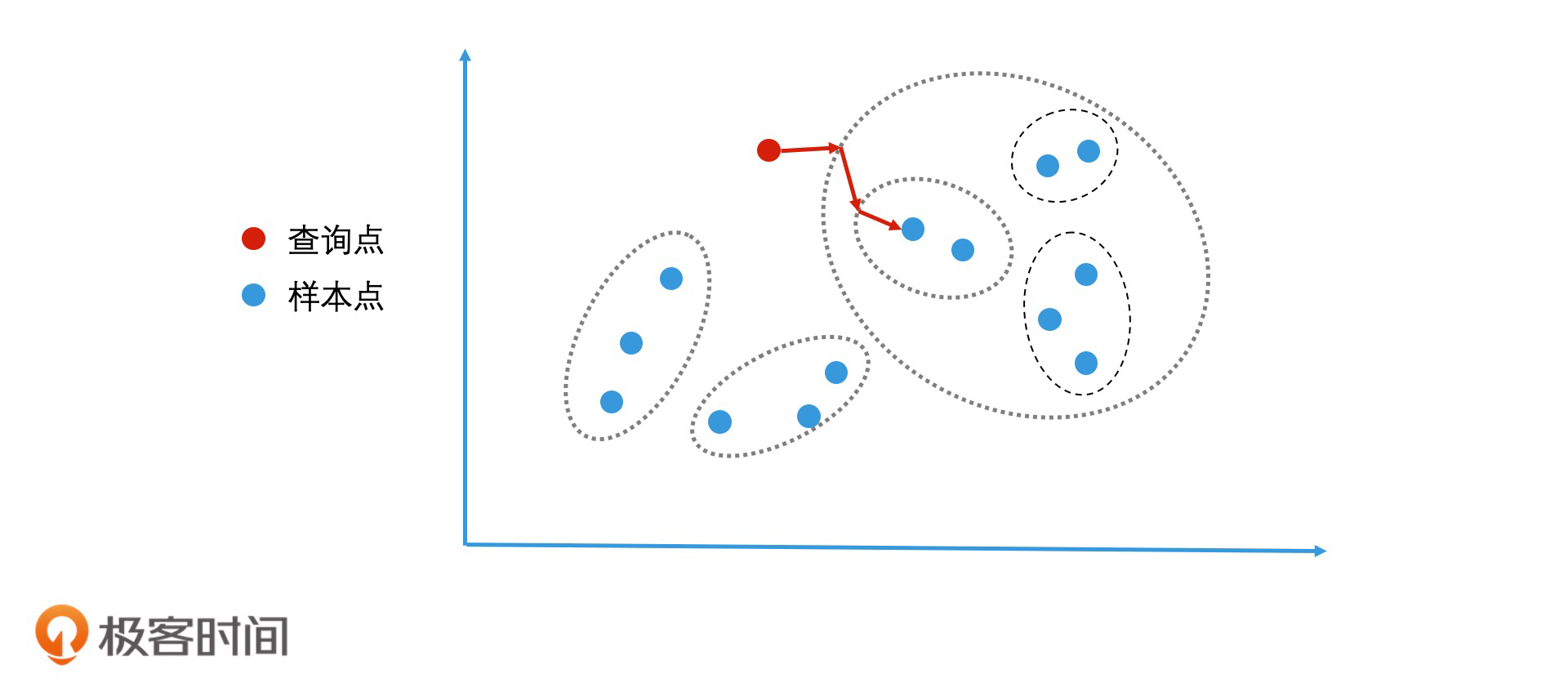 这个过程中会有两种常见情况出现。第一种,最近的聚类中的节点数非常多。这个时候,我们就计算该聚类中的所有节点和查询点的距离,这个代价会很大。这该怎么优化呢?这时,我们可以参考二分查找算法不断划分子空间划分的思路,使用层次聚类将一个聚类中的节点,再次划分成多个聚类。这样,在该聚类中查找相近的点时,我们通过继续判断查询点和哪个子聚类更相近,就能快速减少检索空间,从而提升检索效率了。