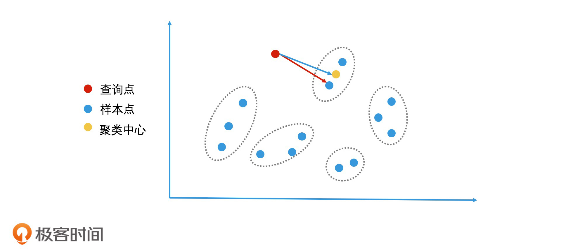 好了,明确了这一点之后,我们接着来说一下计算过程。这整个计算过程会涉及3个主要向量,分别是样本向量、查询向量以及聚类中心向量。你在理解这个过程的时候,要注意分清楚它们。