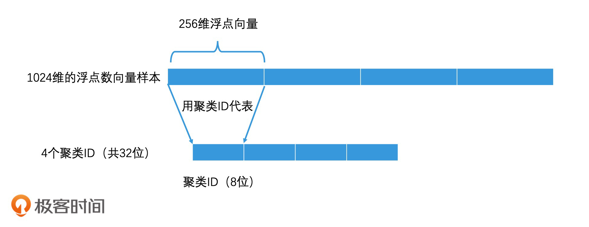 如果我们的样本向量都是1024维的浮点数向量,那我们可以将它分为4段,这样每一段就都是一个256维的浮点向量。然后,在每一段的256维的空间里,我们用聚类算法将这256维空间再划分为256个聚类。接着,我们可以用1至256作为ID,来为这256个聚类中心编号。这样,我们就得到了256 * 4 共1024个聚类中心,每个聚类中心都是一个256维的浮点数向量(256 * 4字节 = 1024字节)。最后,我们将这1024个聚类中心向量都存储下来。