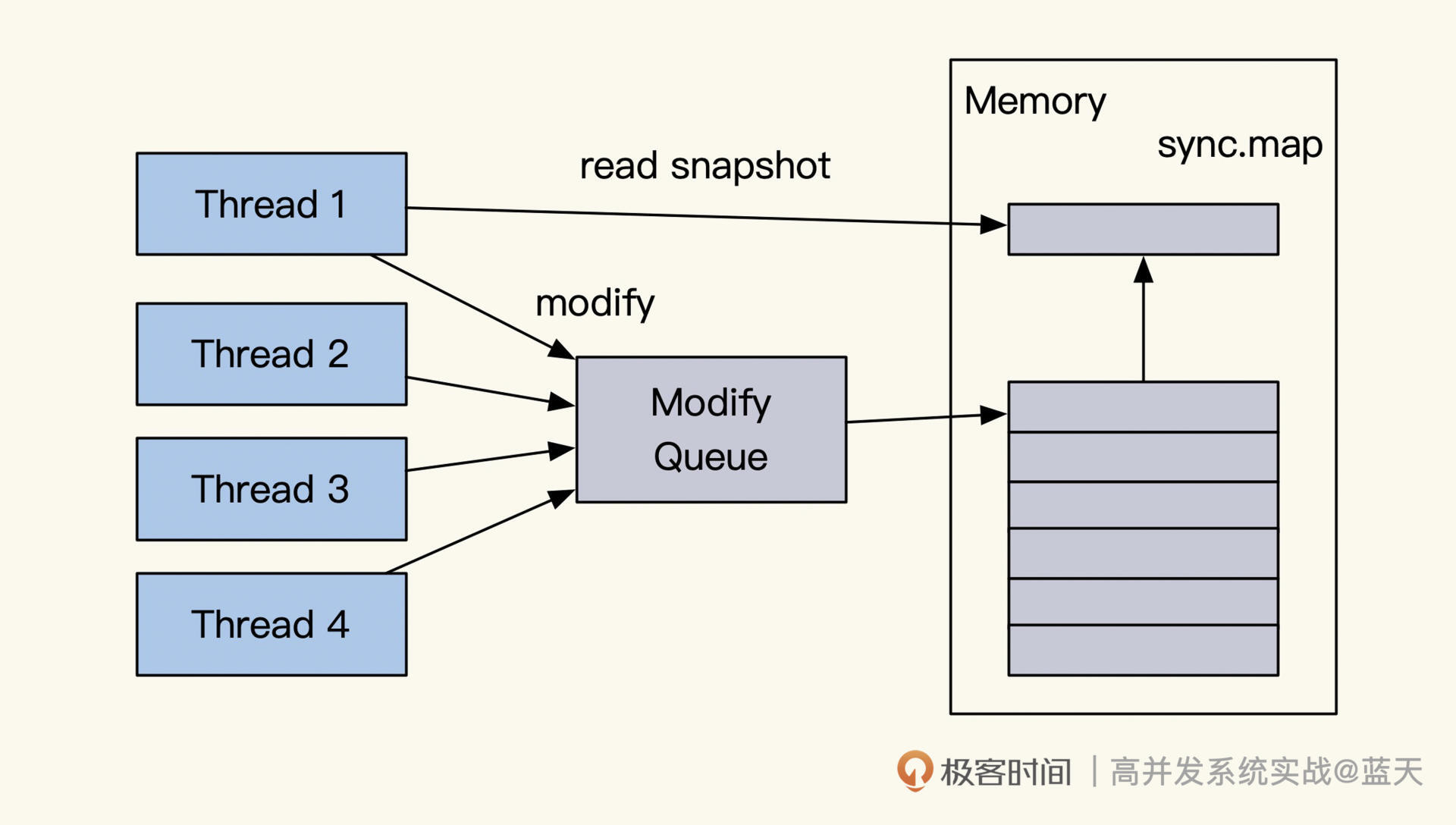 除此之外还有一种方式,就是将我们的修改、读取等变动只通过一个线程去执行,这样能够减少锁冲突加强执行效率,我们常用的Redis就是使用类似的方式去实现的,如下图所示: