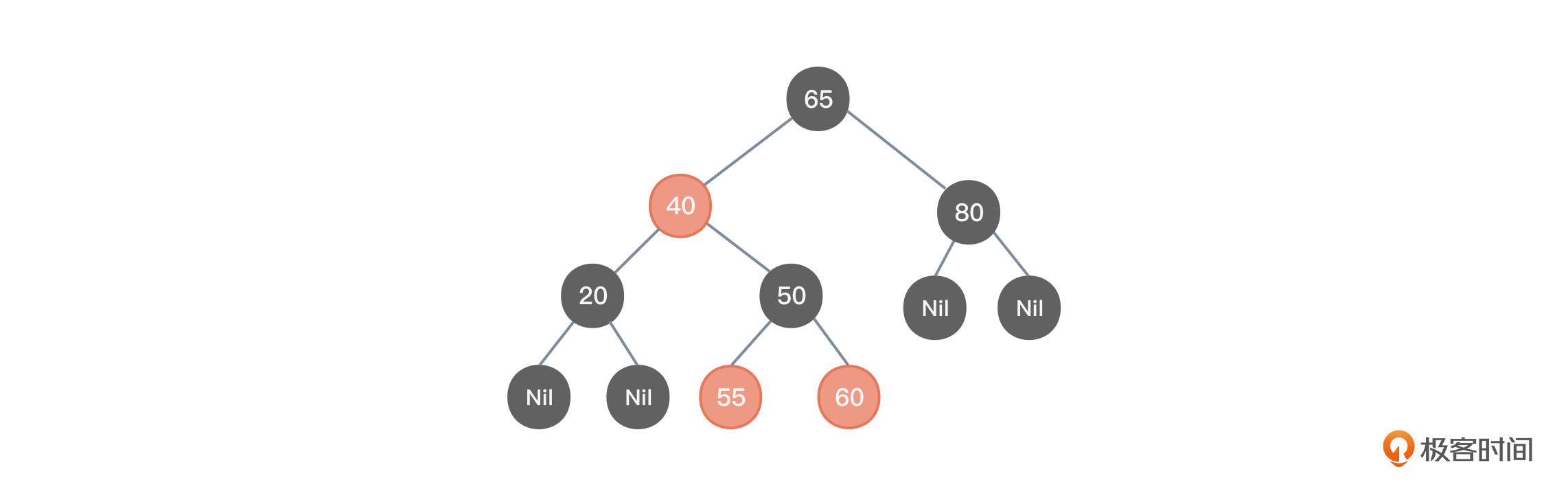 - 从节点65要访问到节点55的左下叶子节点(图中没有画出但仍旧是存在的),需要经过65→40→50→55→Nil,这其中显然包括了65、50、Nil这三个黑色节点。