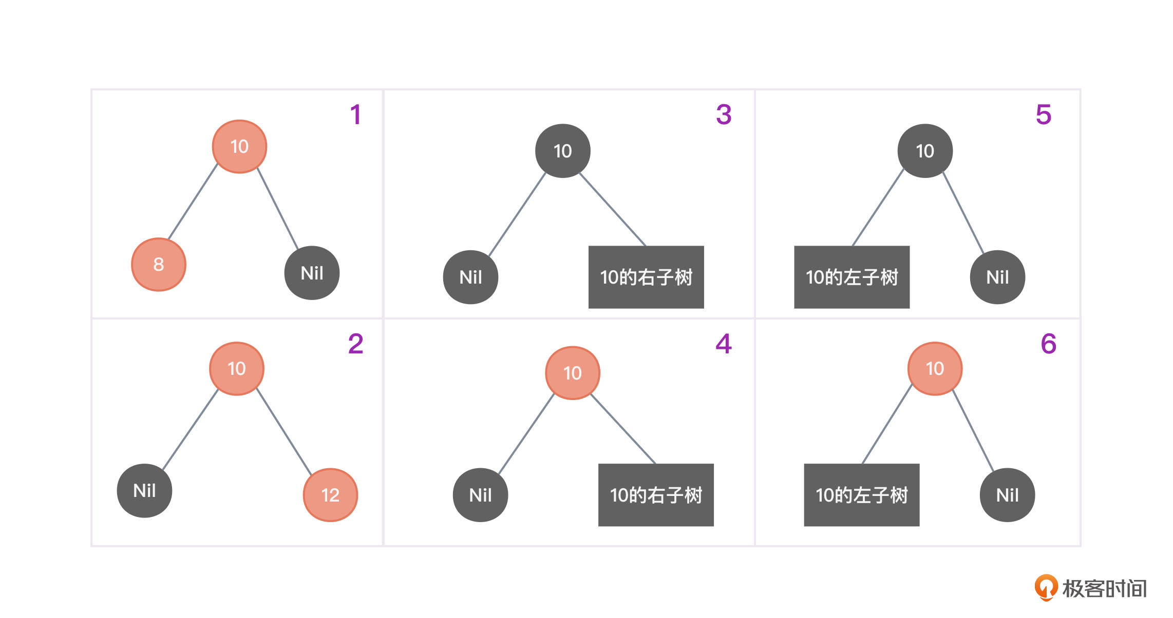 - 编号为6的二叉树红色节点10有黑色的左子节点却无右子节点,违背性质4。