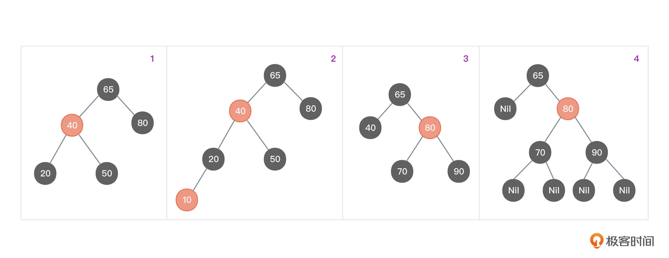 图3中第1个图是一棵红黑树,如果希望为节点20增加一个新的左孩子节点10,节点10必须是红色以保证红黑树的性质4(65→40→20→10→Nil包含3个黑色节点,到所有其他叶子节点也都包含3个黑色节点),参见图3第2个图,也是一棵红黑树。