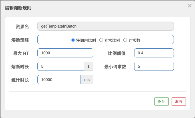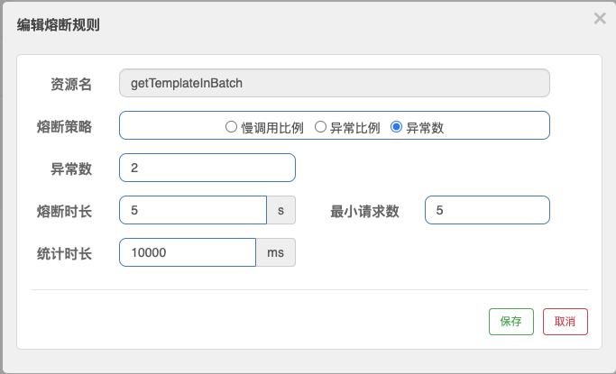 “异常数”熔断规则和前面我们设置的异常比例熔断规则几乎一样,唯一的区别就是“异常数”的判定条件是统计窗口内发生异常的个数,而不是去统计异常请求的比例。在下面这张图里,我设置了一个基于异常数判定的规则,即getTemplateInBatch请求在10秒内异常数>2,则触发5秒的熔断窗口。