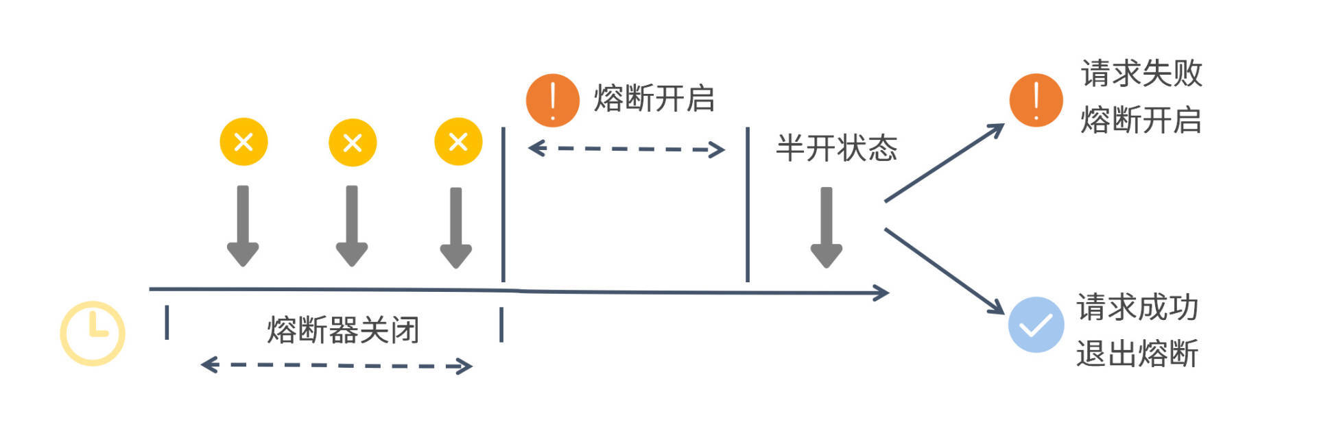 从图中你可以看出,在第一个统计窗口内熔断器是处于关闭状态的,达到熔断判定条件之后,Sentinel开启了一段熔断窗口。在这段窗口时间内,熔断器是处于开启状态的,这时新的服务请求会执行降级逻辑。待熔断窗口结束,Sentinel会将熔断器状态置为“半开”状态,这是一个介于完全开启和完全关闭之间的中间态。