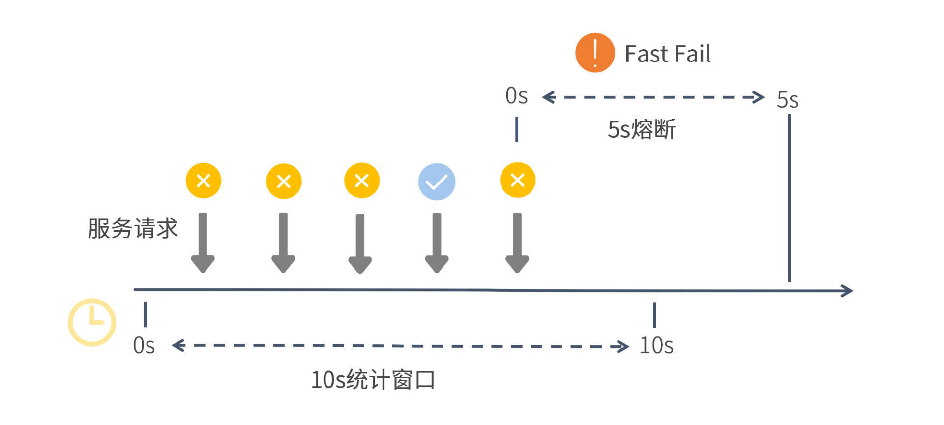 从图中你可以看出,Sentinel底层通过一段跨度为10秒的滑动窗口来统计服务调用情况。在这段窗口时间内,前三个服务请求全部失败,这时失败率已经达到100%,大大超过了我们定义的60%的阈值,但是熔断开关却没有打开,这是因为统计窗口的最小请求数还没有达到设定值5。