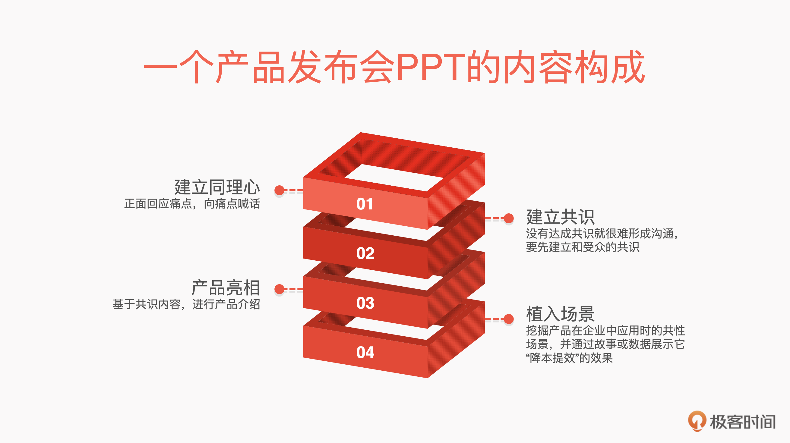 现在我们来看看一个发布会的PPT的内容构成,它通常由四个功能模块组成,即:建立同理心、建立共识、产品亮相和植入场景。