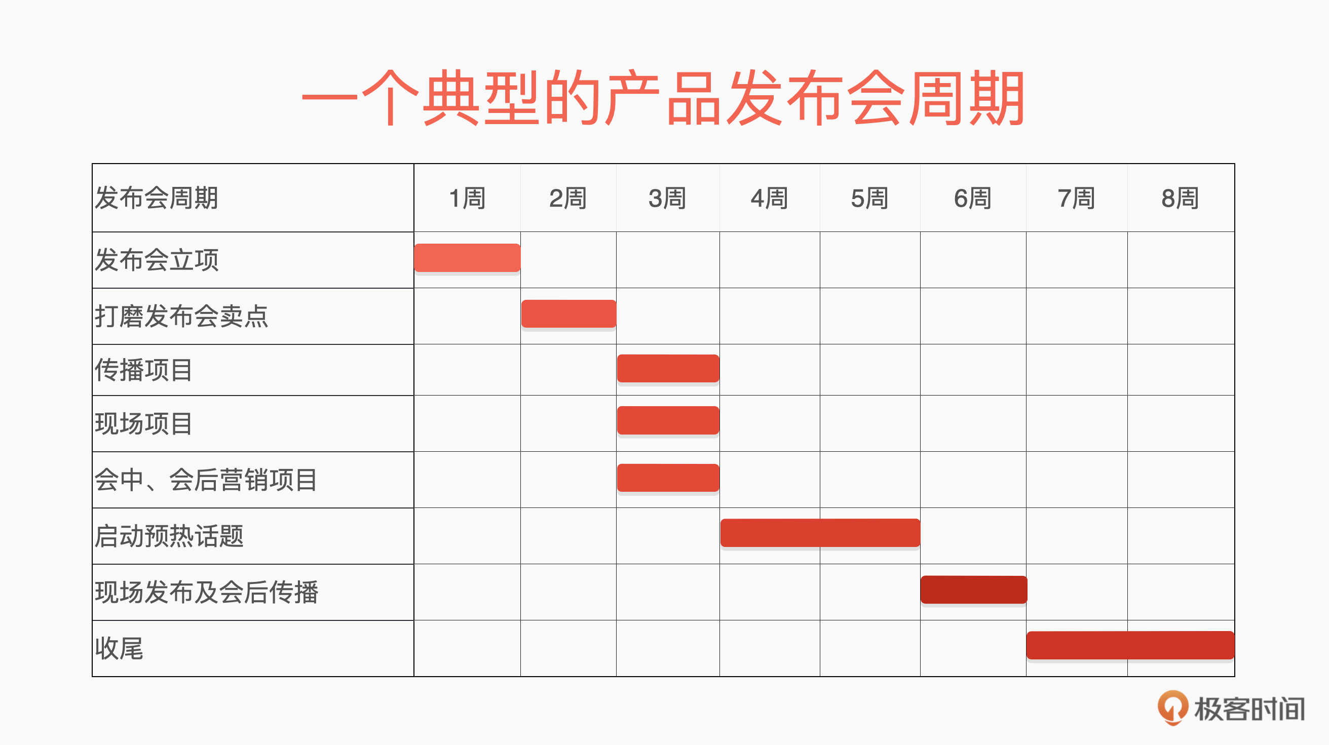 在一个企业里,一个典型的产品发布会准备周期大概在2个月左右。因为,它涉及到无数次的高层汇报和物料准备,为了保证质量,我很少让项目周期小于2个月。当然,我也接过准备周期只有一周的发布项目,这需要公司为它的所有事项“开绿灯”,但是这是极少数的情况,所以我们就不在这里探讨了。